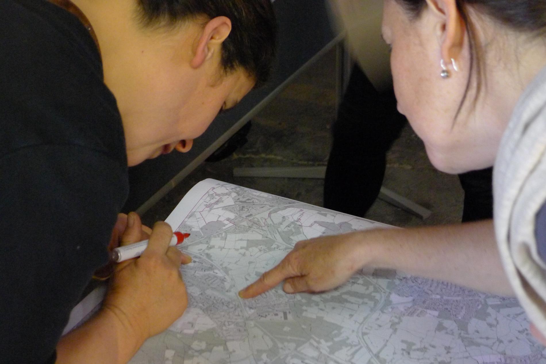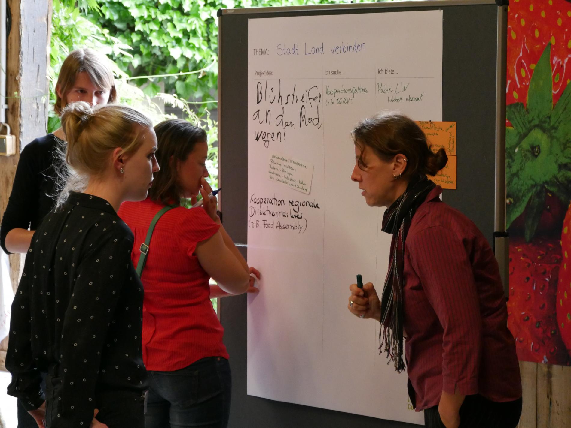 Nach dem Einstieg in die Thematik erhielten die Akteure das Wort: in fünf moderierten Gesprächsrunden diskutierten sie die Zukunft des Grünzuges F. Die angesprochenen Themen wurden gesammelt und zu Schwerpunktbereichen für den weiteren Verlauf der Veranstaltung zusammengefasst. Nach einer kurzen Erfrischungspause, die viele Teilnehmer zur Fortsetzung ihrer Diskussionen nutzten, folgte der dritte Veranstaltungsteil: Die Ideenbörse. An den fünf Themenständen „Miteinander lernen und arbeiten“, „Nahrungsmittel produzieren und vertreiben“, „Vielfältige Kulturlandschaft“, „Stadt und Land verbinden“ und „Netzwerke aufbauen“ entwickelten die Akteure gemeinsam erste Projektideen.